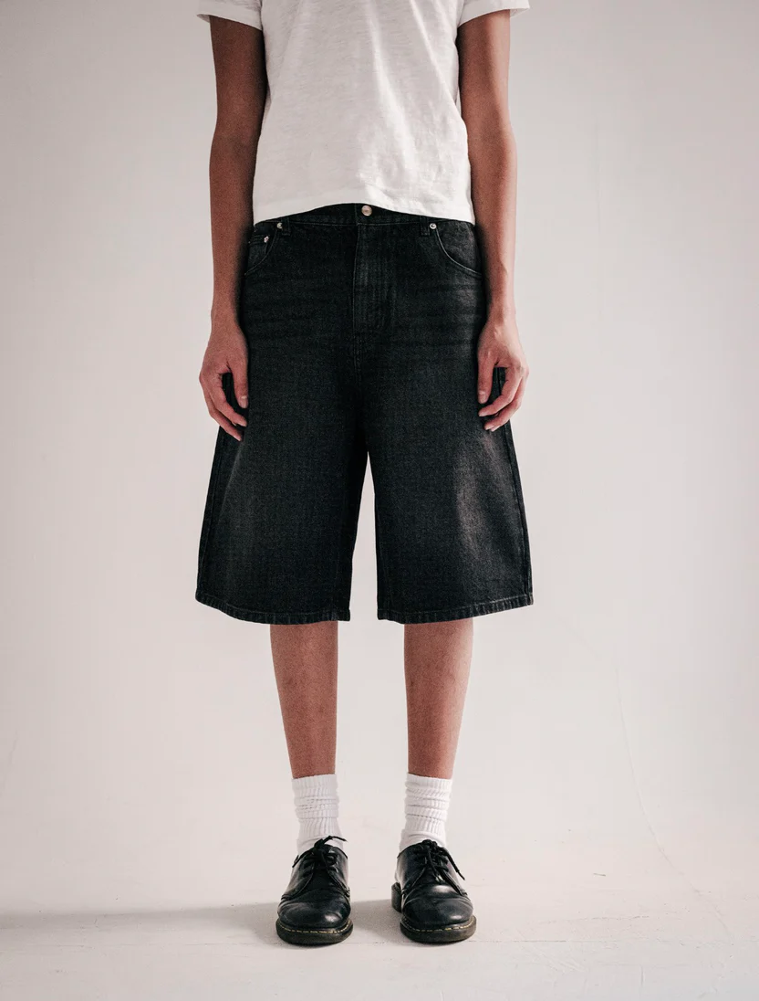 The Uniforum Baggy Jorts are made from a raw indigo 15.2oz 100% organic cotton denim. The premium jorts feature a 2 pronged button, genuine leather patch, classic selvedge ID, and below the knee baggy fit.